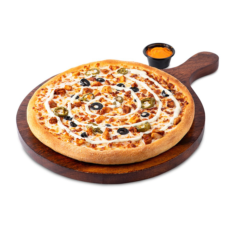 Loaded with a generous amount of toppings of Fajita chicken, corn, mushrooms, green peppers,onions, black olives, Cheddar & mozzarella cheese.